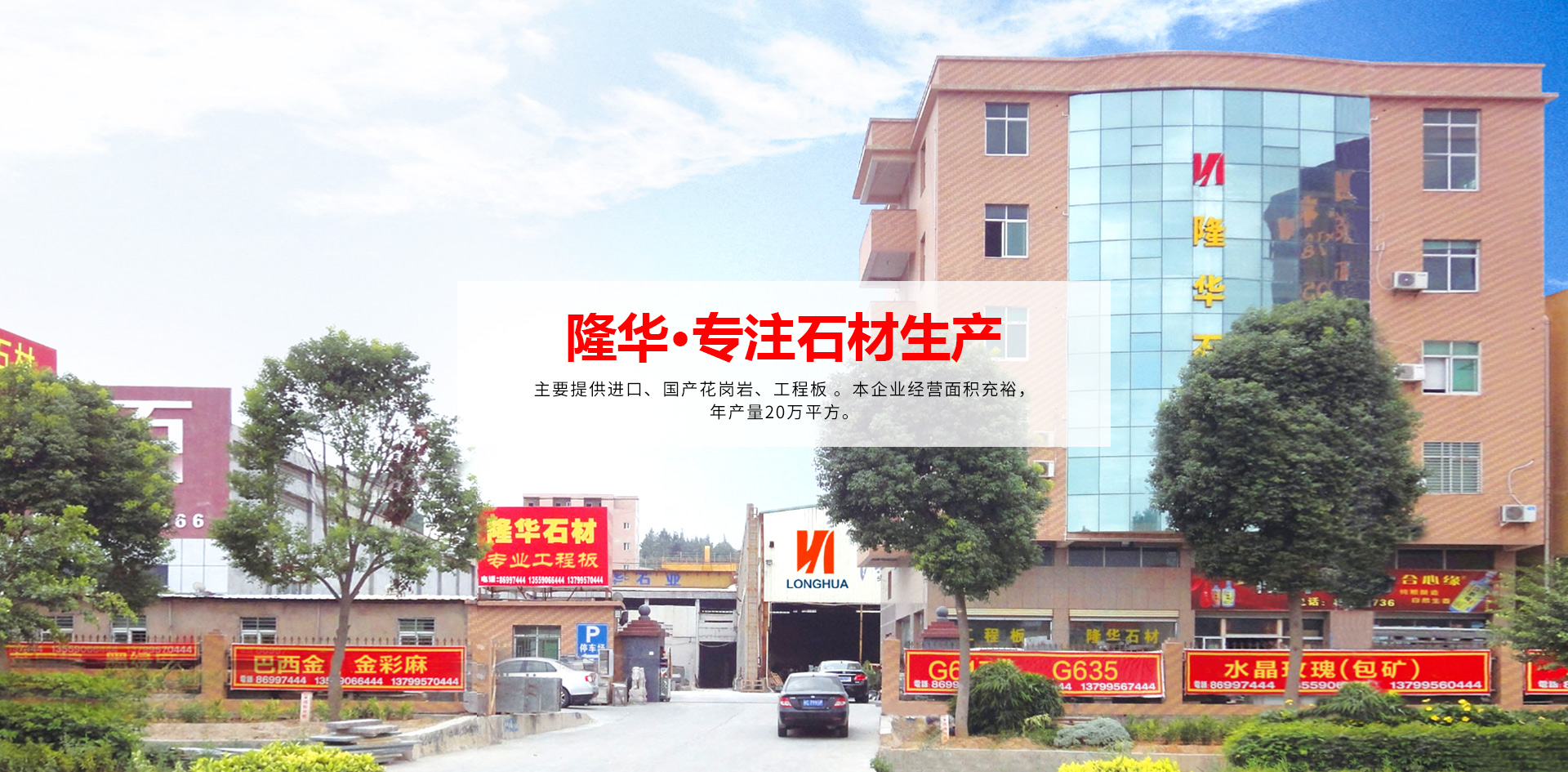 ??福建省南安市隆華石材有限公司注冊資金3000萬元人民幣,位于位于素有“石材之鄉”美譽的福建省南安市水頭西錦工業區康利對面,地理位置優(yōu)越。公司主要加工銷售各種花崗巖石材及大理石精加工,具備生產供應圓形、異型、平板、薄板等工藝石品的綜合能力,設備配套齊全。目前已配備橋切機多臺,全自動磨光機2臺,紅外線切邊機多臺,行吊多臺,叉車多部,擁有繩鋸、線條機、雕刻機等齊全的配套設備及相關的完善供配電系統、機械維修設備等。